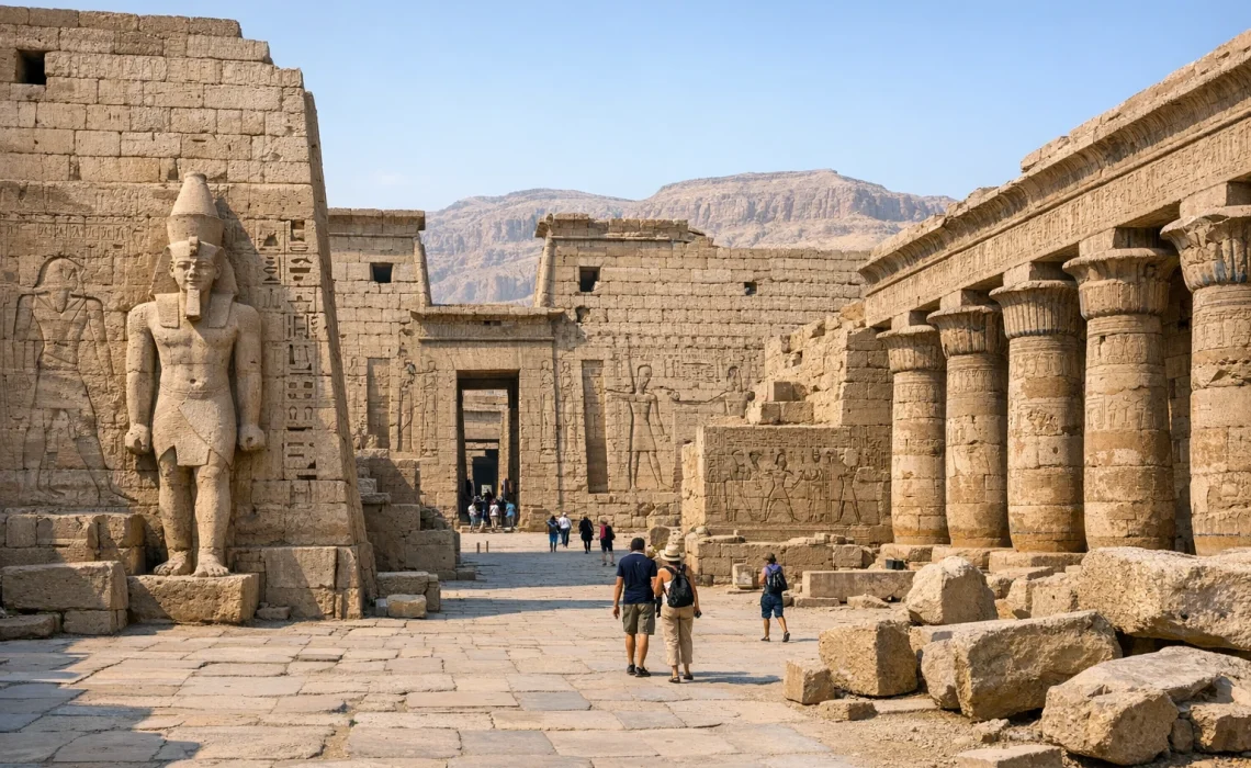 Najlepszy efekt daje zwiedzanie o poranku lub późnym popołudniem, gdy słońce nie „spłaszcza” reliefów. Światło prześlizguje się po nacięciach dłuta, a cienie wydobywają trójwymiarowość scen. Jeśli lubisz fotografię, Medinet Habu jest wdzięczne: korytarze i dziedzińce tworzą naturalne kadry, a powtarzalność kolumn i murów pozwala bawić się perspektywą.